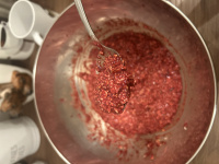Kuraciu pečeň a vločky nasypeme do veľkej misky a tyčovým mixérom rozmixujeme (vločky pridávam postupne...) Pridám varenú mrkvu a petržlen nakrájanú na kocky. Jablko postrúhame aj so šupkou - len poriadne vytlačíme šťavu a pridáme do cesta. Natrháme si alobal na 40cm dlhé plátky. Budeme potrebovať 3 kúsky.