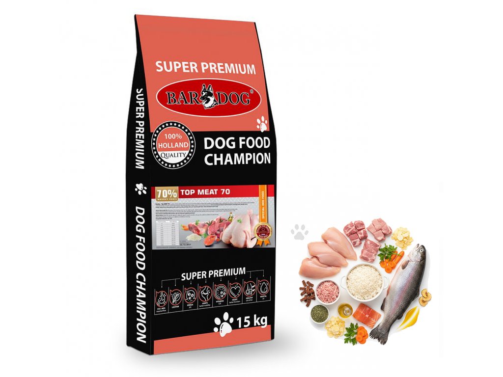Krmivo Top Meat 70 super prémium je vyrobené podľa najnovších poznatkov vedy a výživy na správne stravovanie psov. Suroviny sú zachované bez technologických úprav v prírodnom stave a sú lisované za studena. Vďaka tomu dosahujú vysokú stráviteľnosť a minimálne zaťažujú tráviaci systém. Tieto lisované granuly sú veľmi dobre stráviteľné a obsahuje najmenej 70% sušeného mäsa. Krmivo dosahuje perfektných nutričných hodnôt a obsahuje kuracie, jahňacie, lososie, králičie a bravčové mäso. Kŕmna dávka je vďaka vysokej stráviteľnosti ďaleko nižšia, než u extrudovaných krmív, takže nepreťažuje tráviace ústrojenstvo.